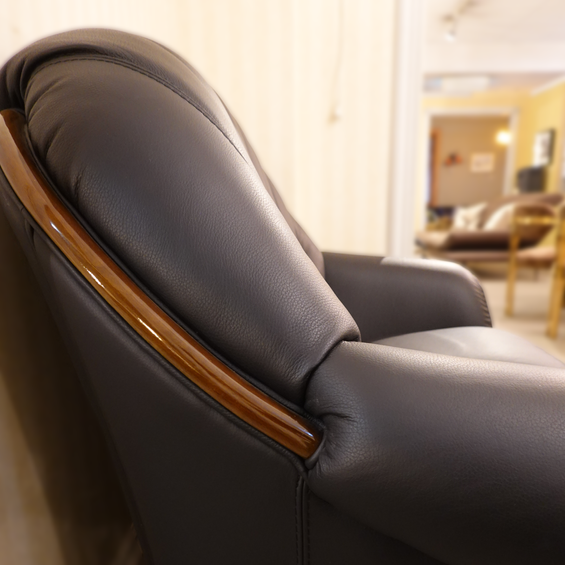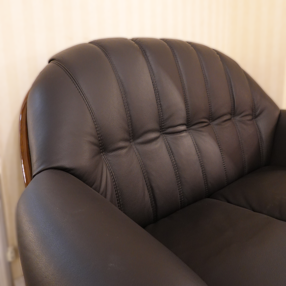 アームから背もたれへと流れる有機的なラインに、ブラックレザーの引き締まった質感が加わることで、より洗練された印象に。