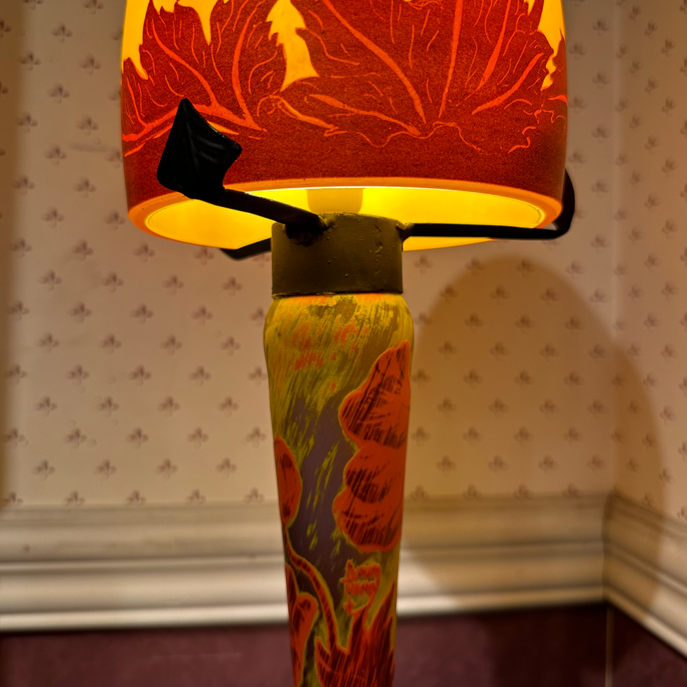 アールヌーヴォーを代表するガラス工芸家、ドーム兄弟による作品を現代のフランス人作家が再現したレプリカ品です。ランプにはドーム・ナンシーのサインがあります。アールヌーヴォーらしく自然を多く取り込んだデザインにより、室内に温かい光をもたらしてくれます。