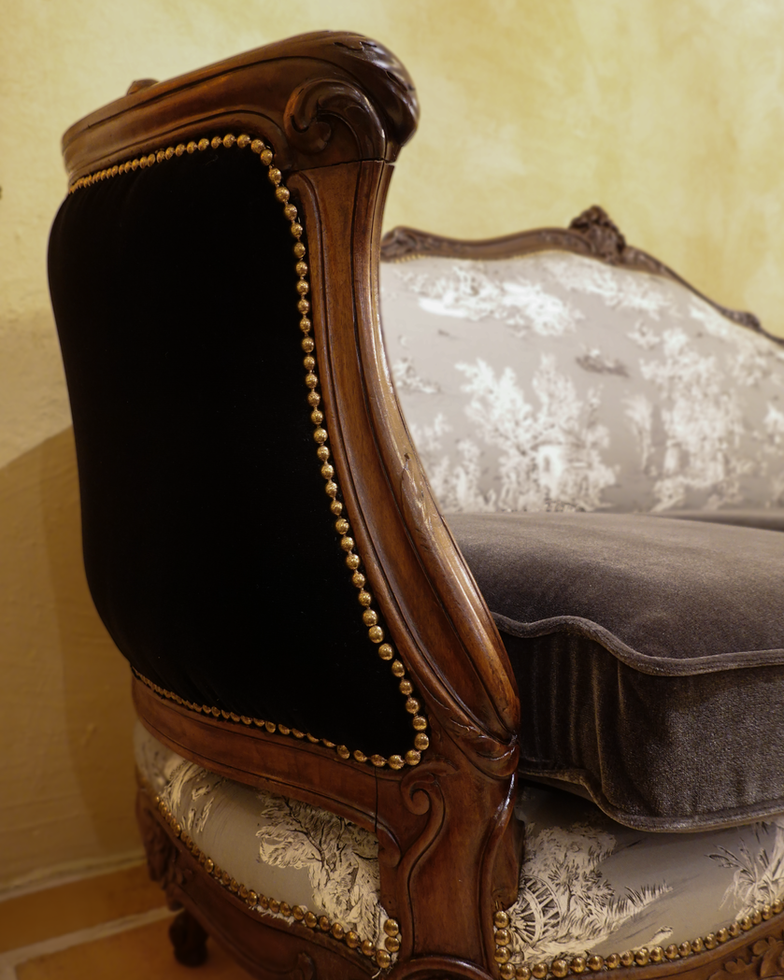 1880年代のフランスで生まれたソファに、フランス製シノワズリーの生地を新たに張り替えた3人掛けソファ。