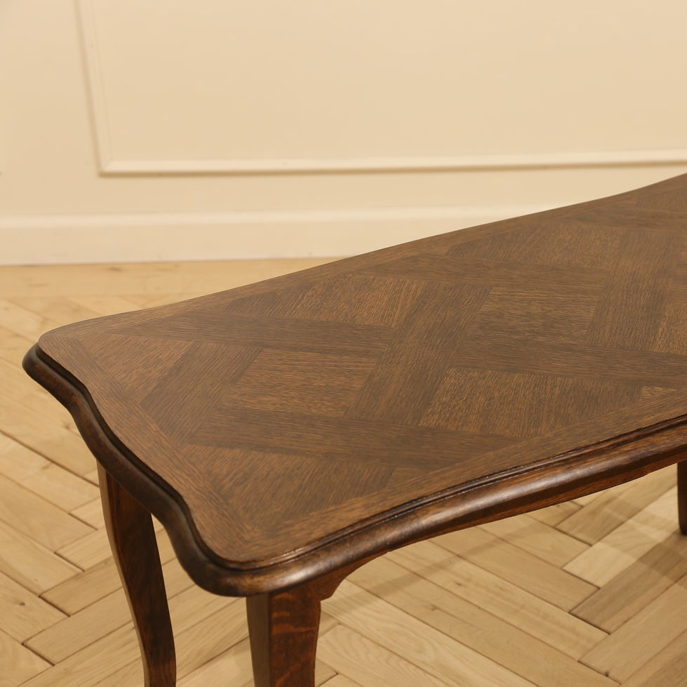 フランス製アンティークのセンターテーブルです。オーク材を使用した格子状の天板が可愛らしいセンターテーブルです。この格子状の模様は見た目だけではなく、無垢材特有の経年による木の反りに対応するため、パーツを小さくして反りの影響を出にくくするというメリットがあります。似たものではヘリンボーンが有名です。機能と美しさにこだわり、100年程経過してもこの状態です。良いものを是非ご自宅に取り入れてください。