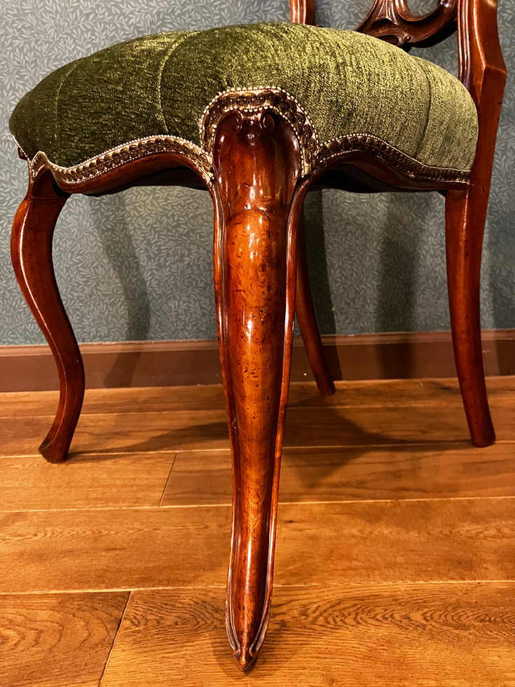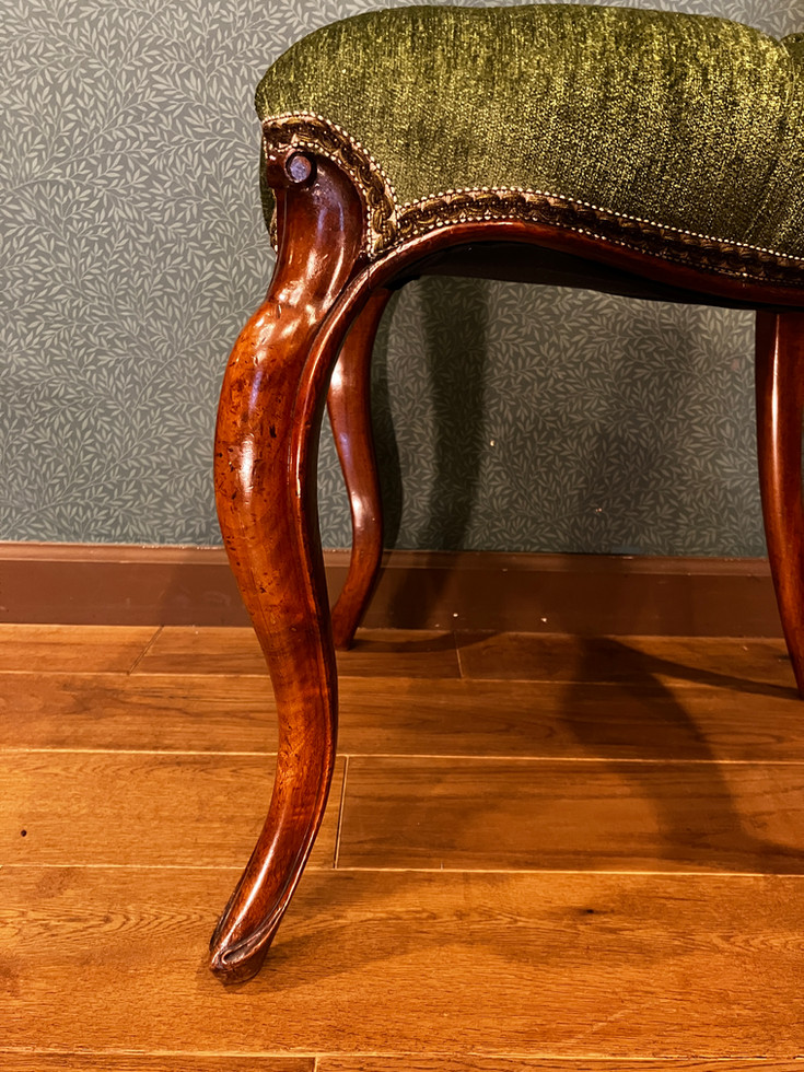 当時の職人の手仕事によって丁寧に仕上げられた木製フレームは、アンティーク家具ならではの気品と存在感を感じさせます。しなやかに伸びる猫脚のラインが、空間にやわらかな印象を与えます。