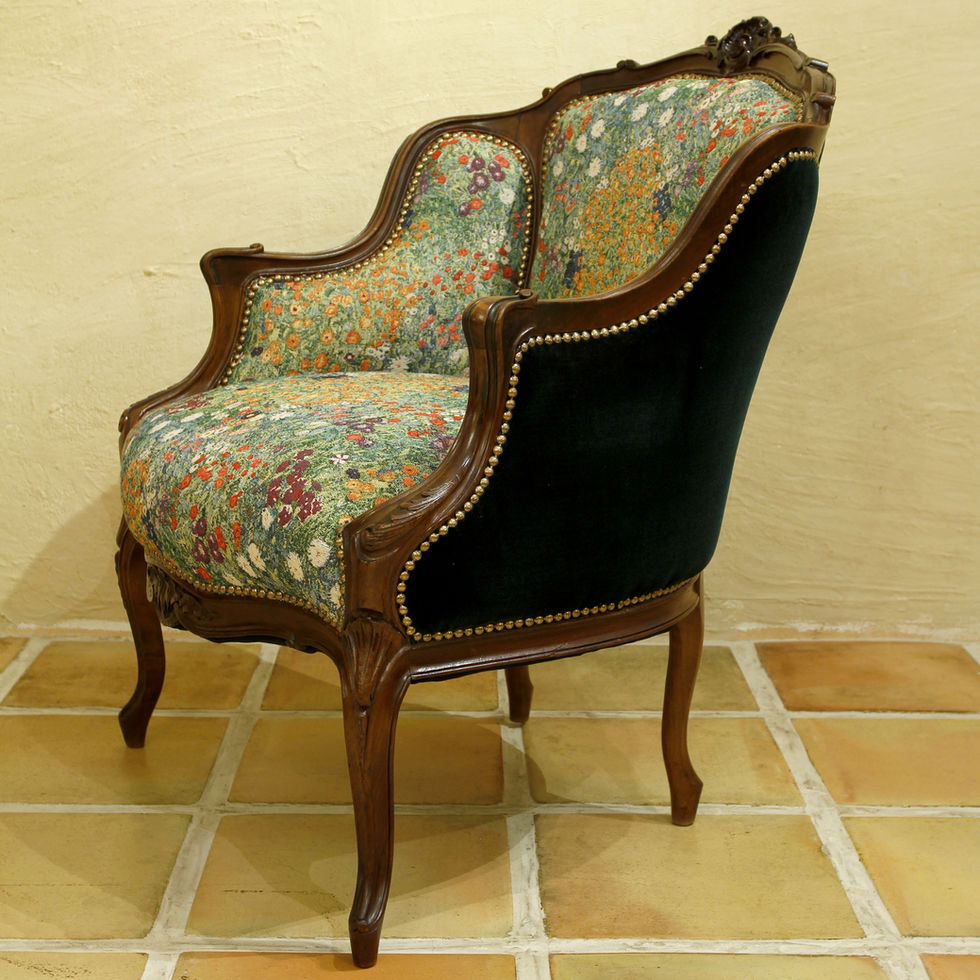 華やかなファブリックが、アンティークの風合いに軽やかさと彩りを添えます。