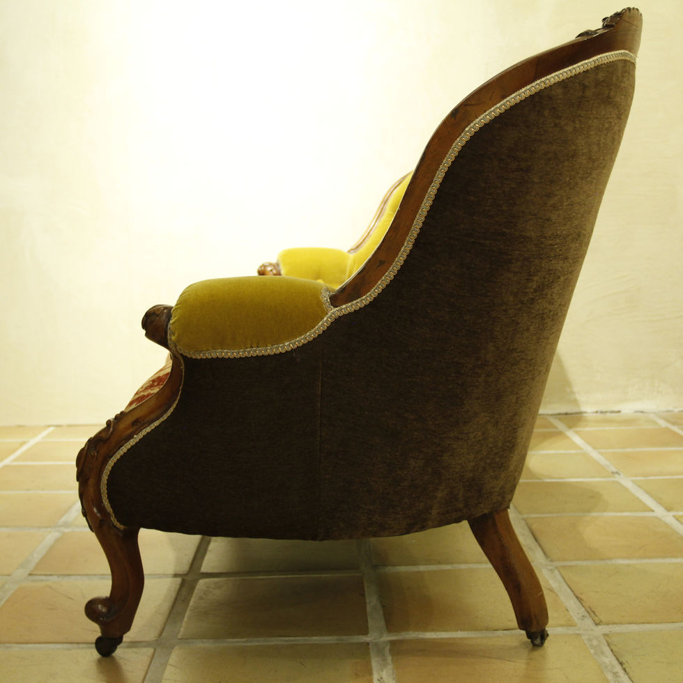 フレームに施された緻密な木彫装飾、背もたれのふっくらとしたボタン締めがフレンチアンティークならではのこだわりを感じさせます。